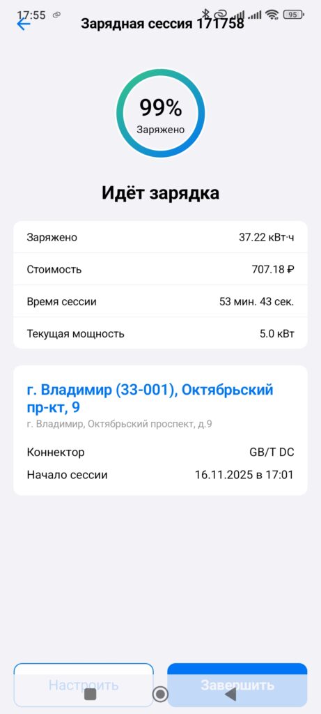 О чудо, в центре была на связи станция «Атом Энерго» у БЦ «Типография» на Октябрьском проспекте. Как – непонятно. Скорее всего она на проводном интернете. Оставался вопрос, как запустить сессию со своего телефона. Подъехал ко станции. Предсказуемо ни приложение «Атом Энерго» ни Electro.cars не загружались. Поддержка Electro.cars удаленно сессию запускать не может. По их совету пришлось договариваться с другом в Москве, чтобы он запустил зарядную сессию во Владимире. Так и зарядился. Станция Парус образца 2024 года с тремя коннекторами по углам. Проблемы с GBT и BYD не возникло.
